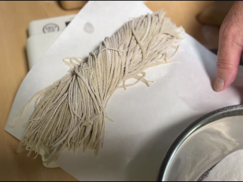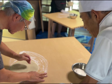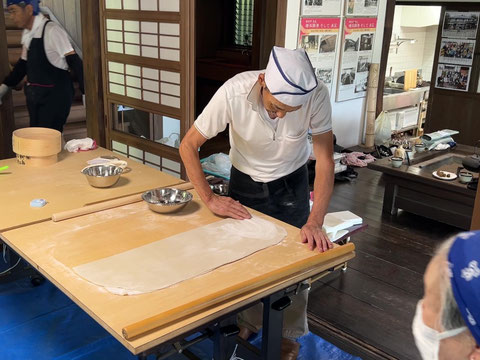 同好会の5名がそれぞれ120gを5束ずつそばを切り、仕上がりを確認したあと、21日のそば打ち体験に向けて打ち合わせを行いました。