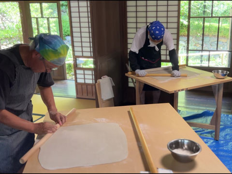 使用したのは、信濃1号と北海道産キタワセをブレンドしたそば粉。つなぎには強力粉100gを加え、合計600gで二八そば(外二)を打ちました。打ってみた感触は大変扱いやすく、素人の方にも向いている粉だそうです。