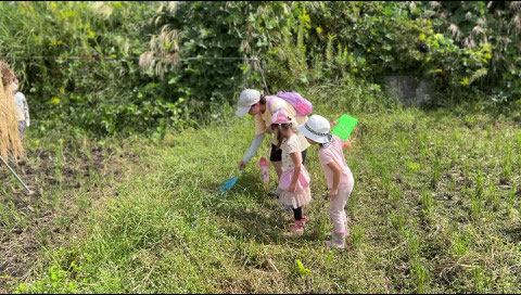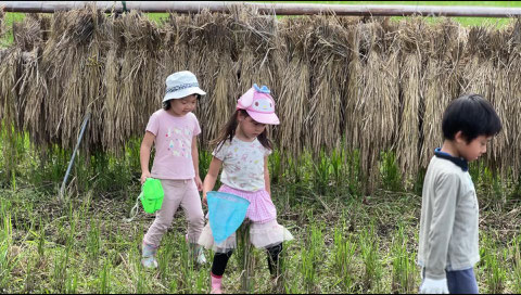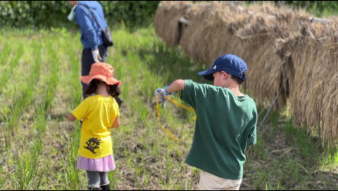 刈り取られた稲は、一束一束きれいに並べられ、結んだあと「はざかけ」にされていきます。稲の香りと土の匂いが秋風に乗って漂い、自然の中で作業する心地よさを感じさせてくれました。自分たちの手で実際にお米を収穫するという貴重な体験は、子どもたちにとって、食べ物の大切さや自然の恵みを実感する素晴らしい学びの場となったことでしょう。
