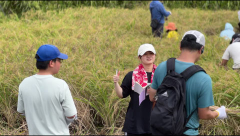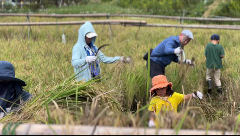 10月4日(土)に予定していた稲刈り体験は、あいにくの雨のため延期となりましたが、翌日の10月5日(日)には、汗ばむ様な日差しに恵まれ、無事に開催することができました。朝から日差しがまぶしく、気温もぐんぐんと上昇。少し蒸し暑さを感じるほどの陽気でしたが、雨が降らないことで稲刈り日和の1日となりました。