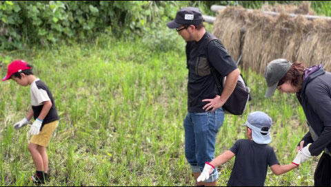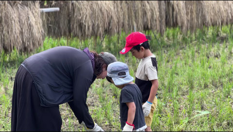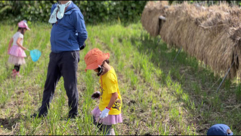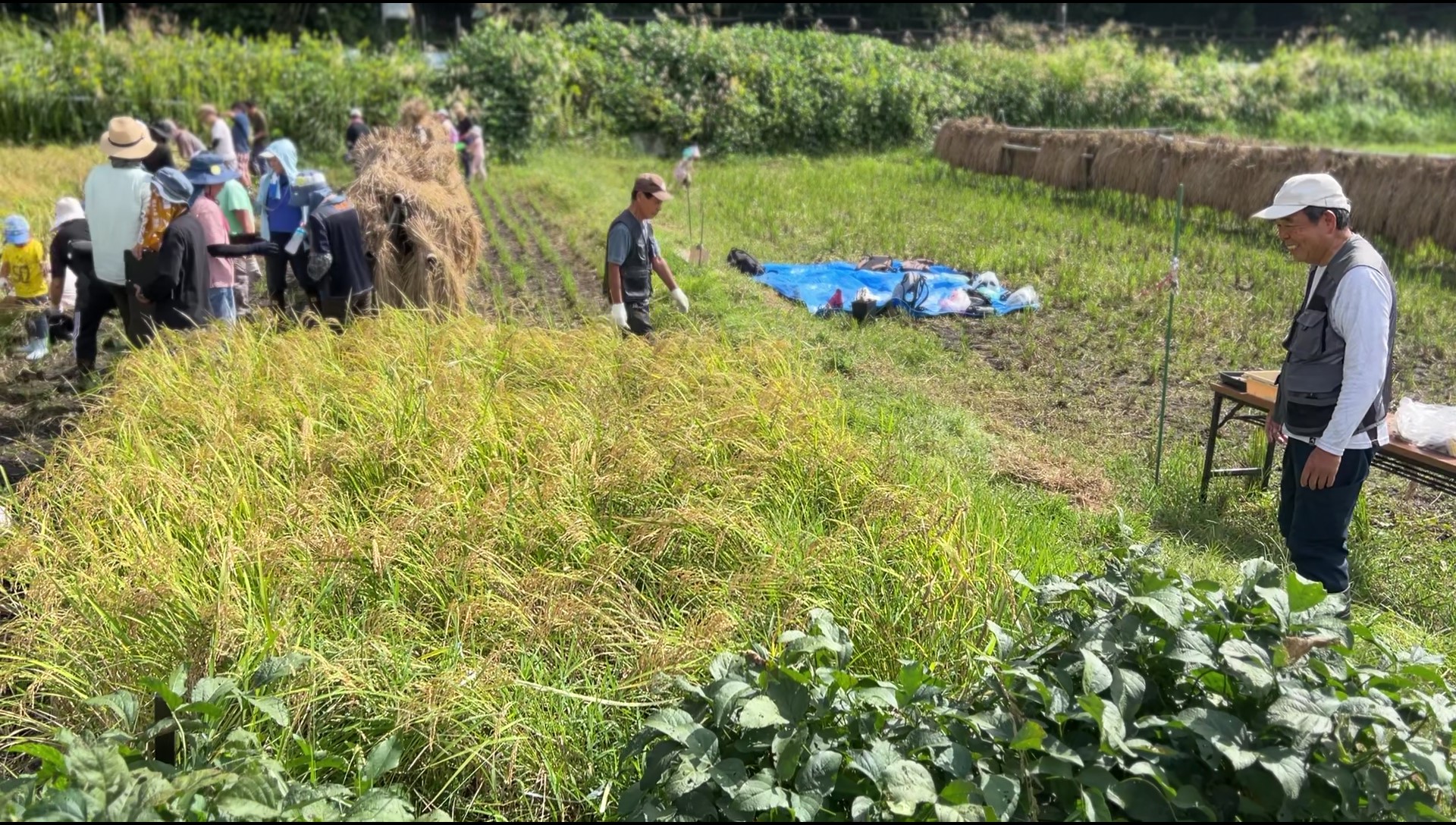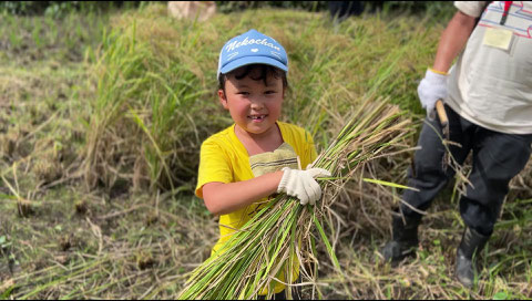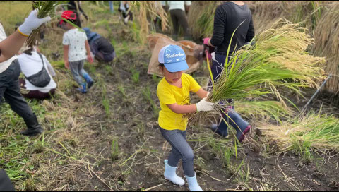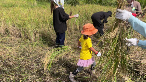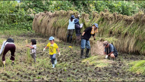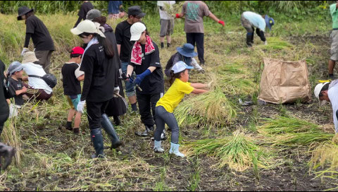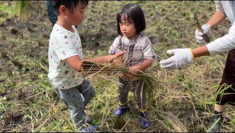 ボランティアの方々も一緒になって丁寧に稲を束ね、田んぼの端では、保護者の方がカメラを構えて子どもたちの頑張る姿を撮影する姿も見られました。中には、泥だらけになりながらも「もっとやりたい!」と目を輝かせる子も多く、その一生懸命な姿に大人たちの表情も自然とほころびます。