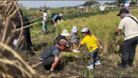 今回の稲刈り体験には、なかよしこども園の先生方と親子連れをはじめ、一般のご家族やボランティアの皆さん、さらに取材に訪れた学生さんなど、総勢42名が参加しました。田んぼには、朝から多くの笑顔が集まり、黄金色に実った稲穂が風に揺れる中、にぎやかで温かい雰囲気が広がっていました。