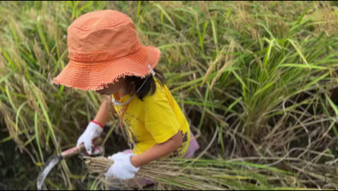 開会のあいさつのあと、スタッフから鎌の使い方や安全に作業を進めるための説明を受け、いよいよ稲刈りがスタート。最初は少し緊張した面持ちだった子どもたちも、鎌を手に一束ずつ稲を刈るうちに、どんどん夢中になっていきました。ザクッ、ザクッと刈るたびに、「わぁ、切れた!」「すごいね!」という声が田んぼ中に響き渡り、まるで秋風と一緒に笑い声が踊っているようでした。