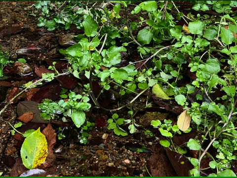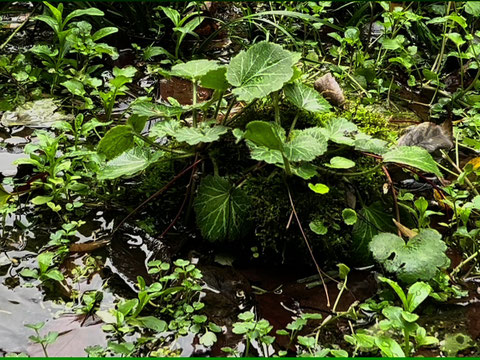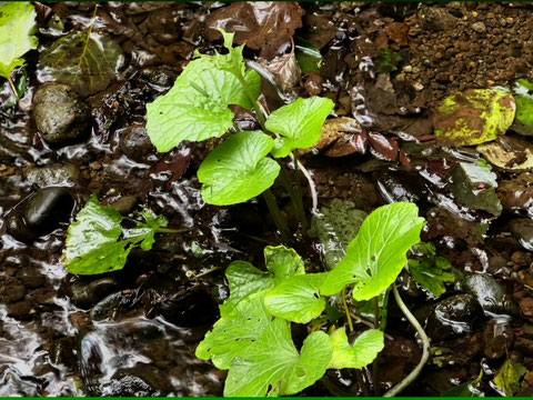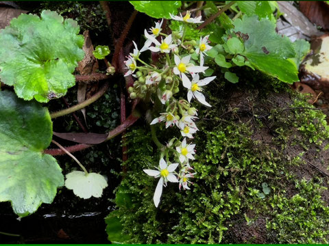 ワサビ田の出口付近では、雪の下がひっそりと葉を重ね、雨のしずくをひとつひとつ抱えていました。