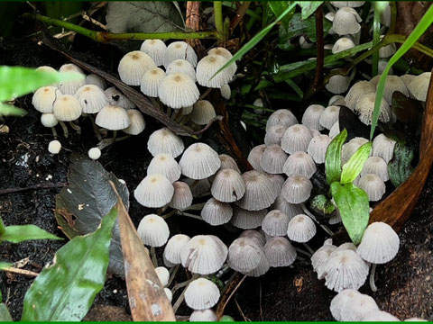 雨の滴る木の階段を下りると、両脇にはイヌセンボンタケがびっしりと息づき、静かな森の中に柔らかな傘の群れを作っていました。