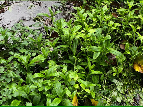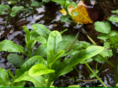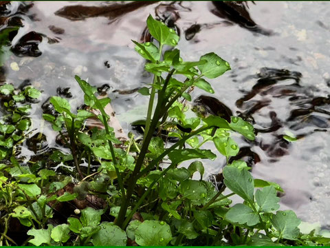 その先に広がるワサビ田では、クレソンが流れに身を揺らし、ワサビの葉が根元から立ち上がって、冷たい湧き水を受けて、どの葉もみずみずしく、凛とした気配をまとっていました。
