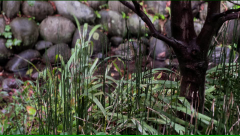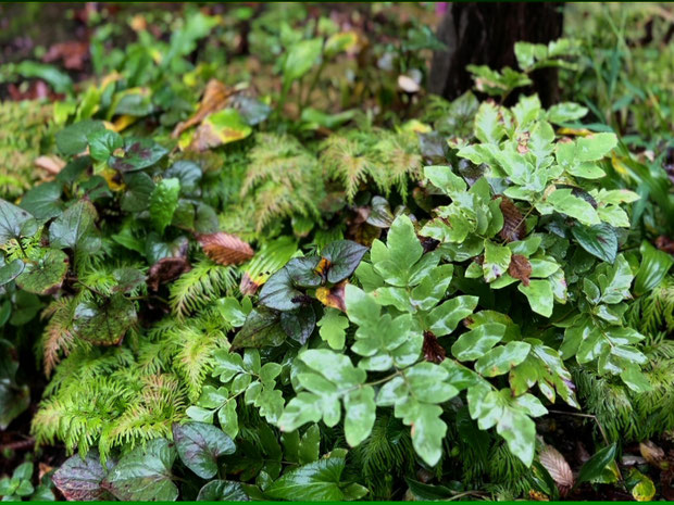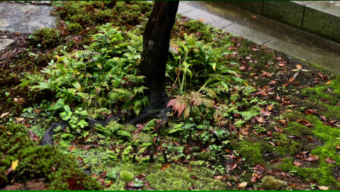 日陰では、ヒカゲノカズラやソテツが静かに息づき、薄靄のような雨の景色の中で、ひっそりとその緑を深めていました。