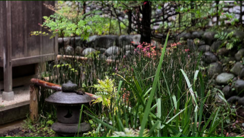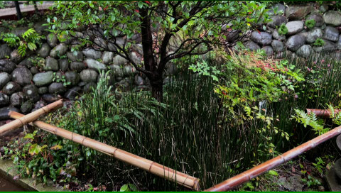 竹手すりの向こうには、トクサが整然と並び、台湾ホトトギスの花が雨の雫を受けてしっとりと揺れ、その合間からは、ナンテンの葉が少しずつ紅を帯びて姿をのぞかせます。