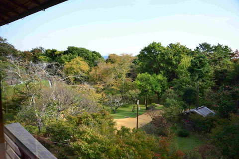 庭園の松並木を抜ける風が心地よく、紅葉のはじまりを感じる景色の中で、お抹茶と和菓子をいただき、往時の趣をしのぶ時間となりました。