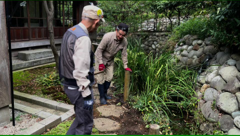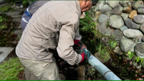 静かな小滝の流れのそばで、竹の香りと金槌の音が響く午後。自然とともにある泉館の風景を守るための、地道で大切な作業となりました。