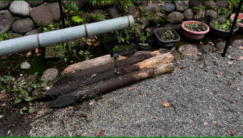 この竹の欄干は、長年の風雨にさらされる中で杭が腐ってしまい、ぐらつきが目立つようになっていました。そのため、古い杭を抜き取り、新しい杭を打ち込む作業を実施。ところが、思った以上に杭が長く、しかも深く埋まっていたため、抜き取りには大変な苦労がありました。