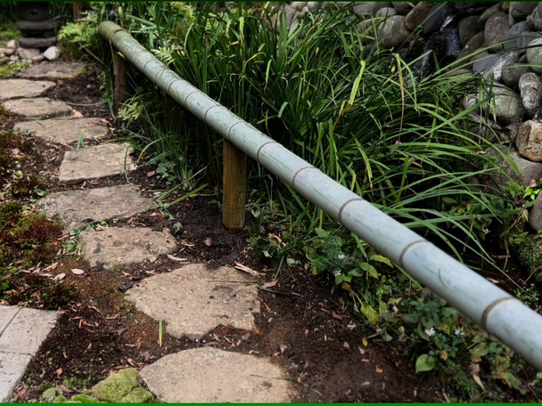 10月29日(水)、泉館の裏庭・小滝前にて、竹の欄干の付け替え作業をボランティアさん2名が行いました。